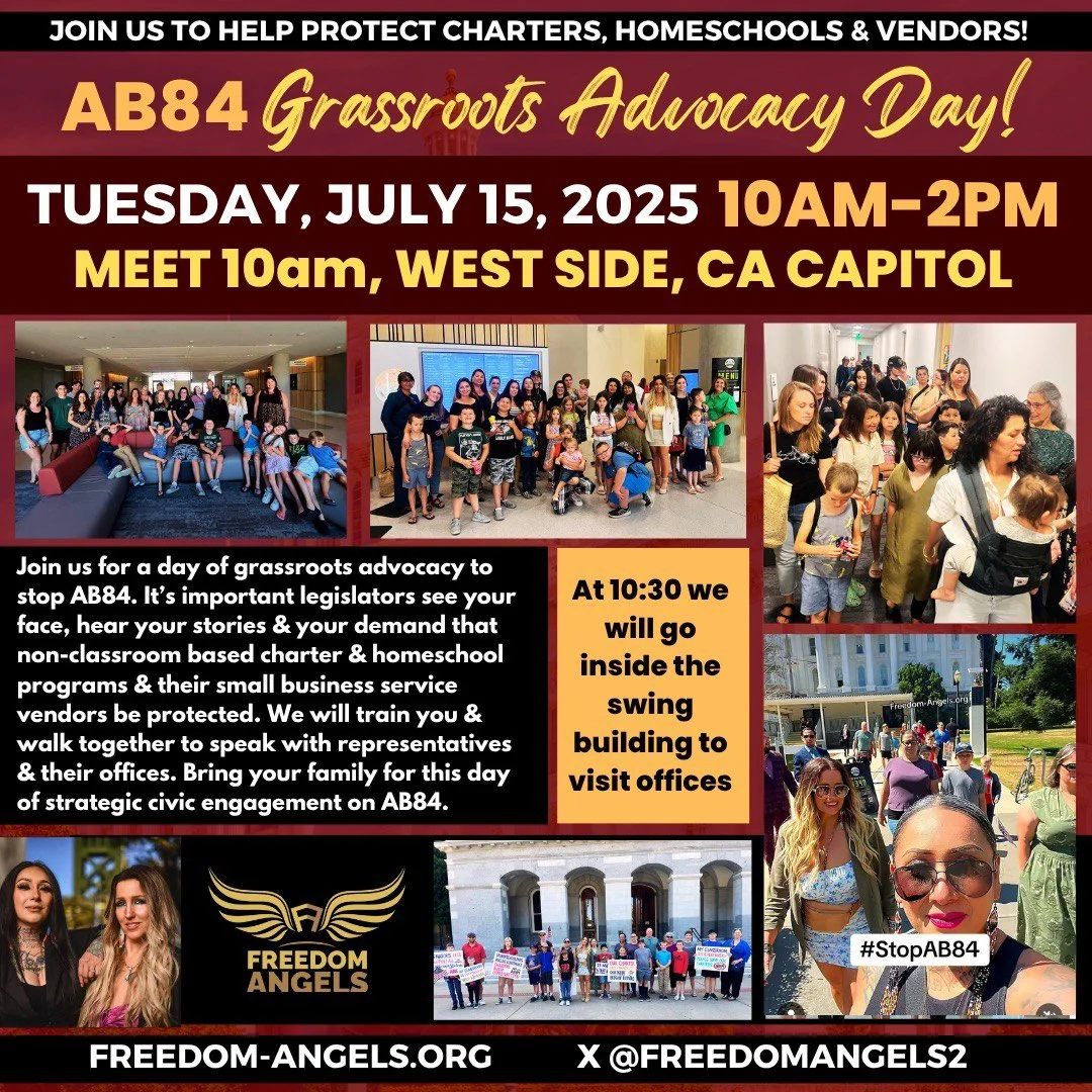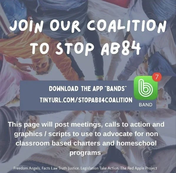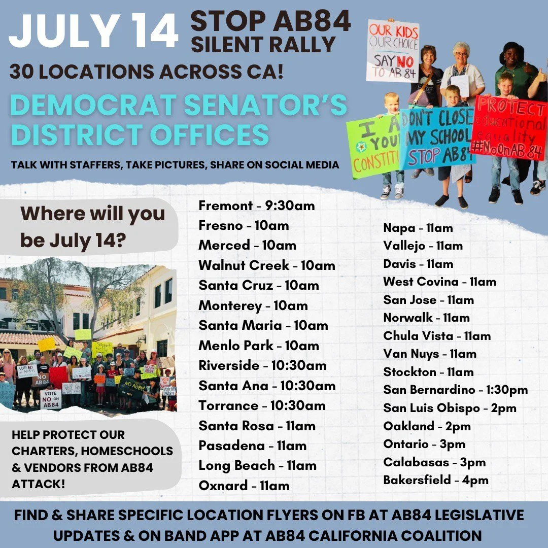 AB84 will destroy non-classroom based charter school & homeschool programs & put service vendors out of business in California. Click the link for the current call-to-action to oppose AB84 and easily contact your legislators, find scripts and connect with them on social media.