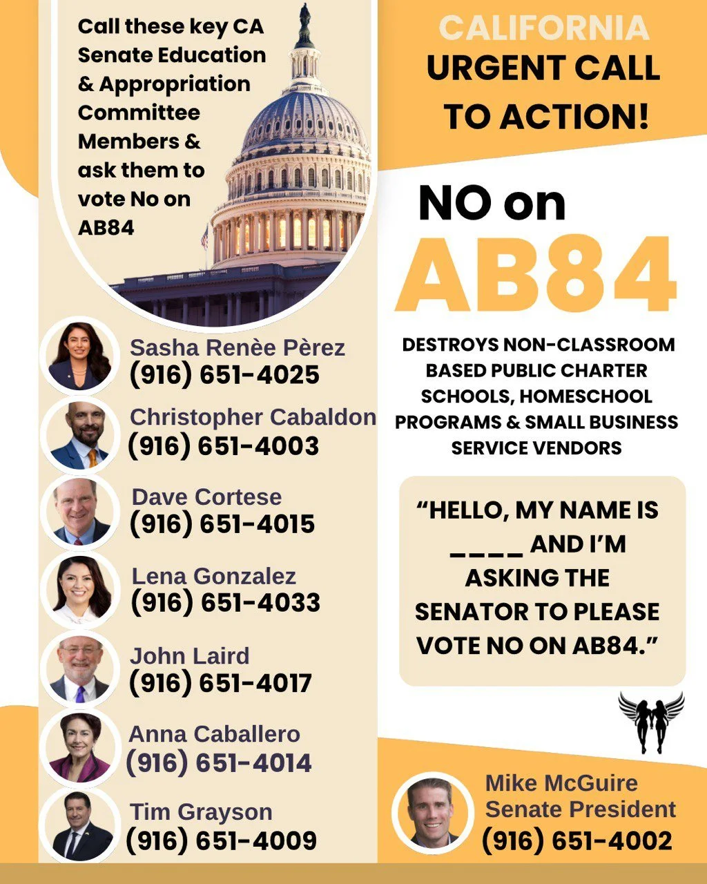 CALL THESE KEY CA SENATORS TO OPPOSE AB84
